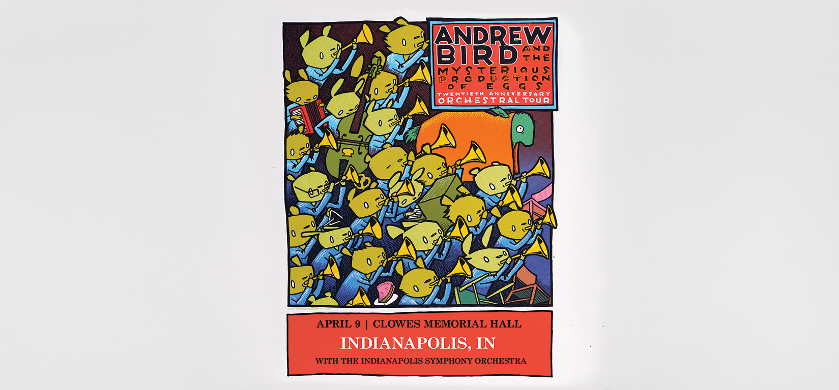 With a distinctive sound that resists categorization, Grammy nominated violinist, songwriter and multi-instrumentalist, Andrew Bird, makes his debut with the Indianapolis Symphony Orchestra. Balancing swelling sounds with jazz, folk, and pop melodies in an unforgettable display of unique virtuosity, Bird celebrates the 20th anniversary of his acclaimed record The Mysterious Production of Eggs. Featuring a top-to-bottom album performance with orchestral arrangements, Bird caps off the performance with a suite of fan-favorite tunes from his near 30-year repertoire.